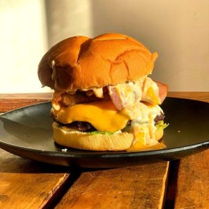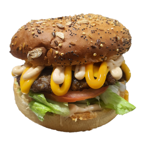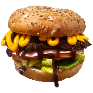 beef-lettuce-mozzarella-cheddar-burger sauce-honey mustard sauce