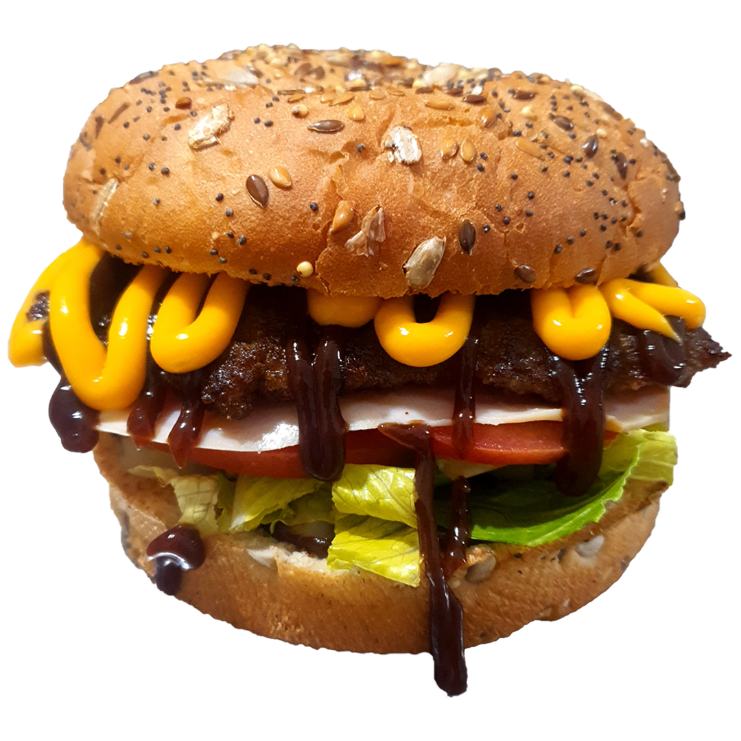 beef-lettuce-tomato-cheese-mozzarella stick-onion ring-baked turkey-sauce