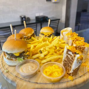 4 mini cheese burger- 5 pcs nachos- fries-sauce