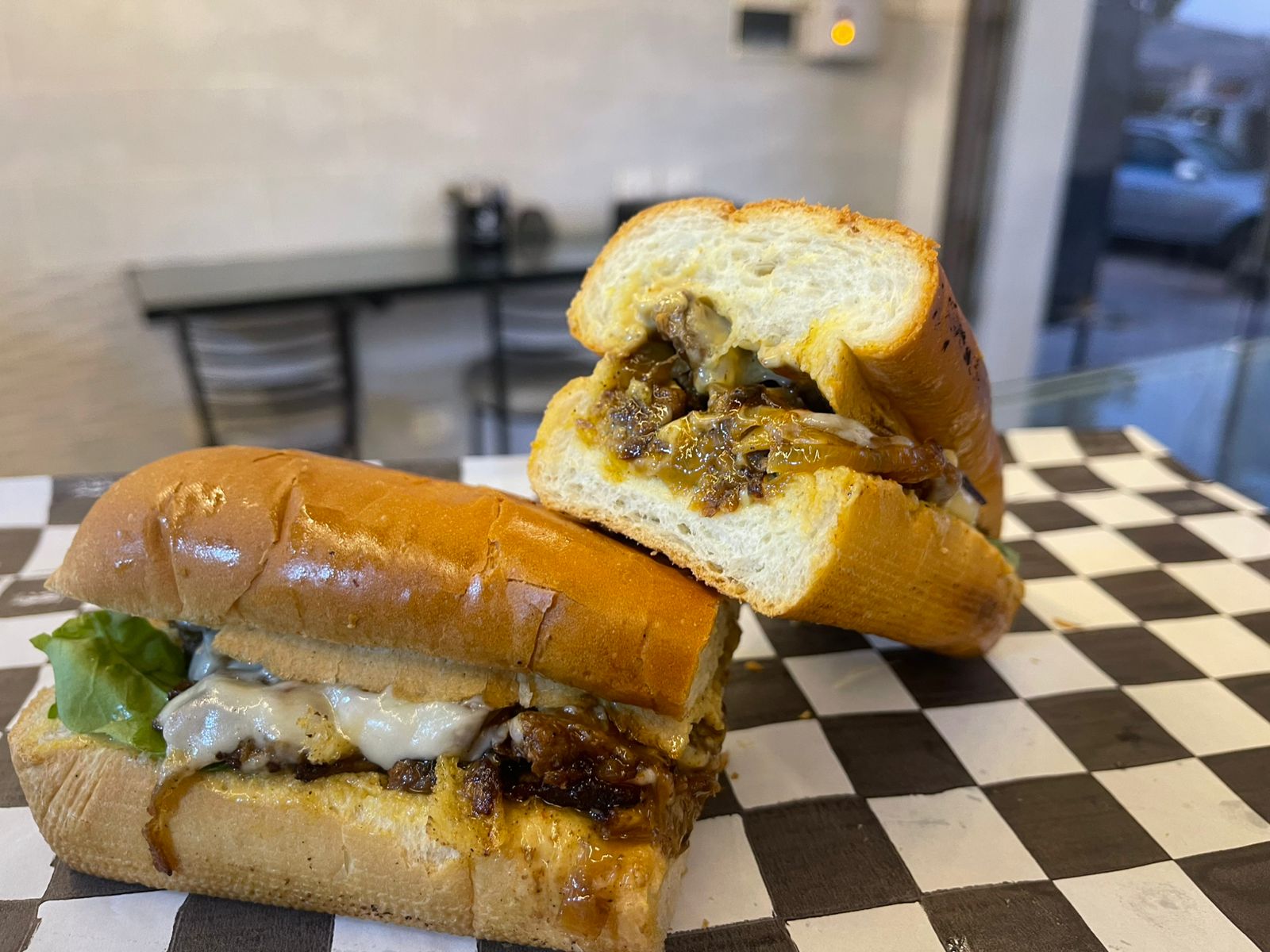 beef steak-caramelized onion-mushroom- special sauce- mozzarella-baby rocket